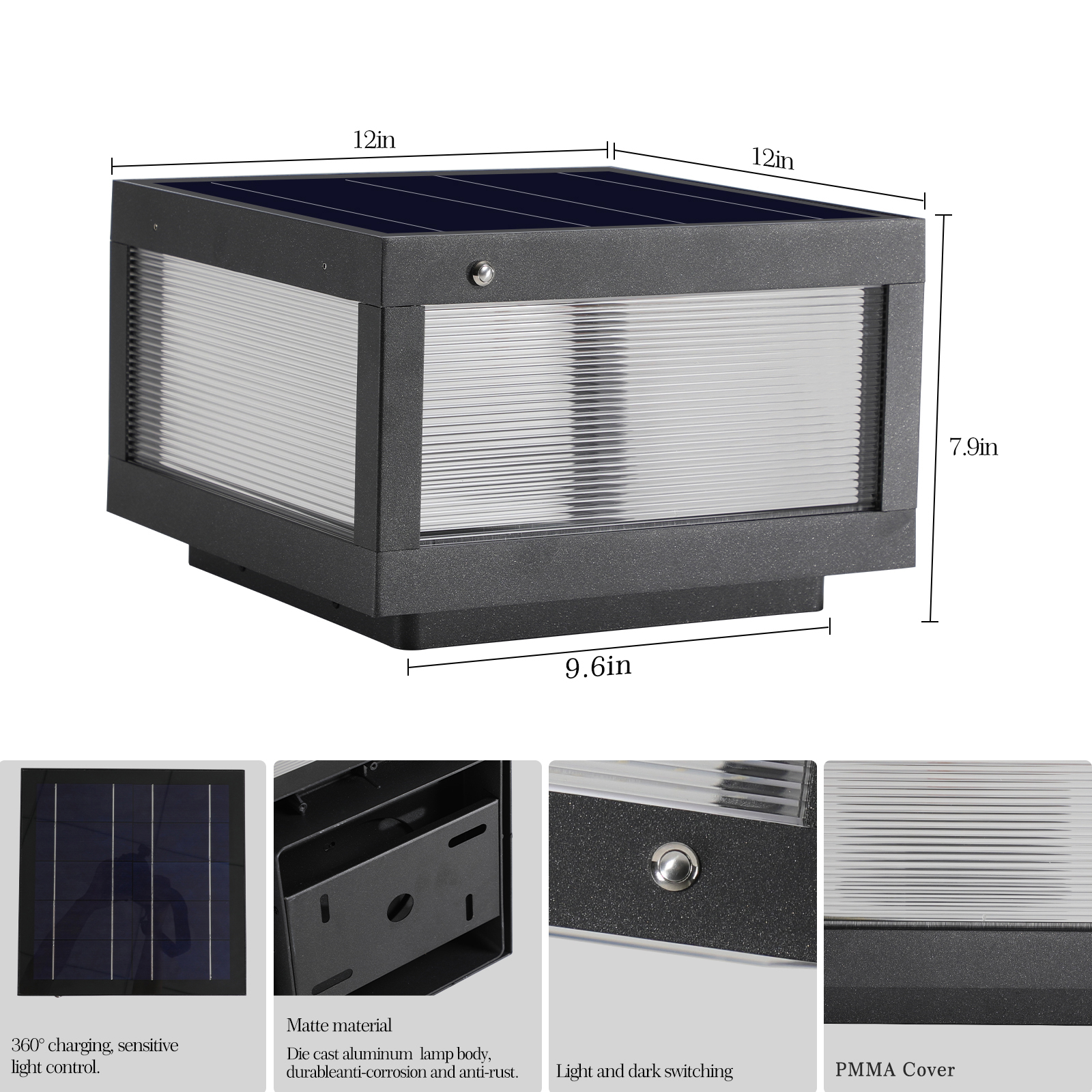 Product Name:12" Black Solar Powered LED Post Cap Light, Modern Outdoor LED Fence Light for Pathways, Decks, and Patios (1-Pack)