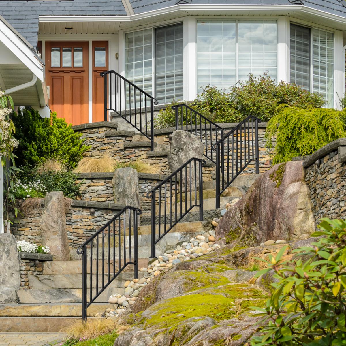 Handrails For Outdoor Steps, Black Wrought Iron Handrail Fits 3 Or 4 Steps, Transitional Handrail With Installation Kit, Stair Railing For Concre